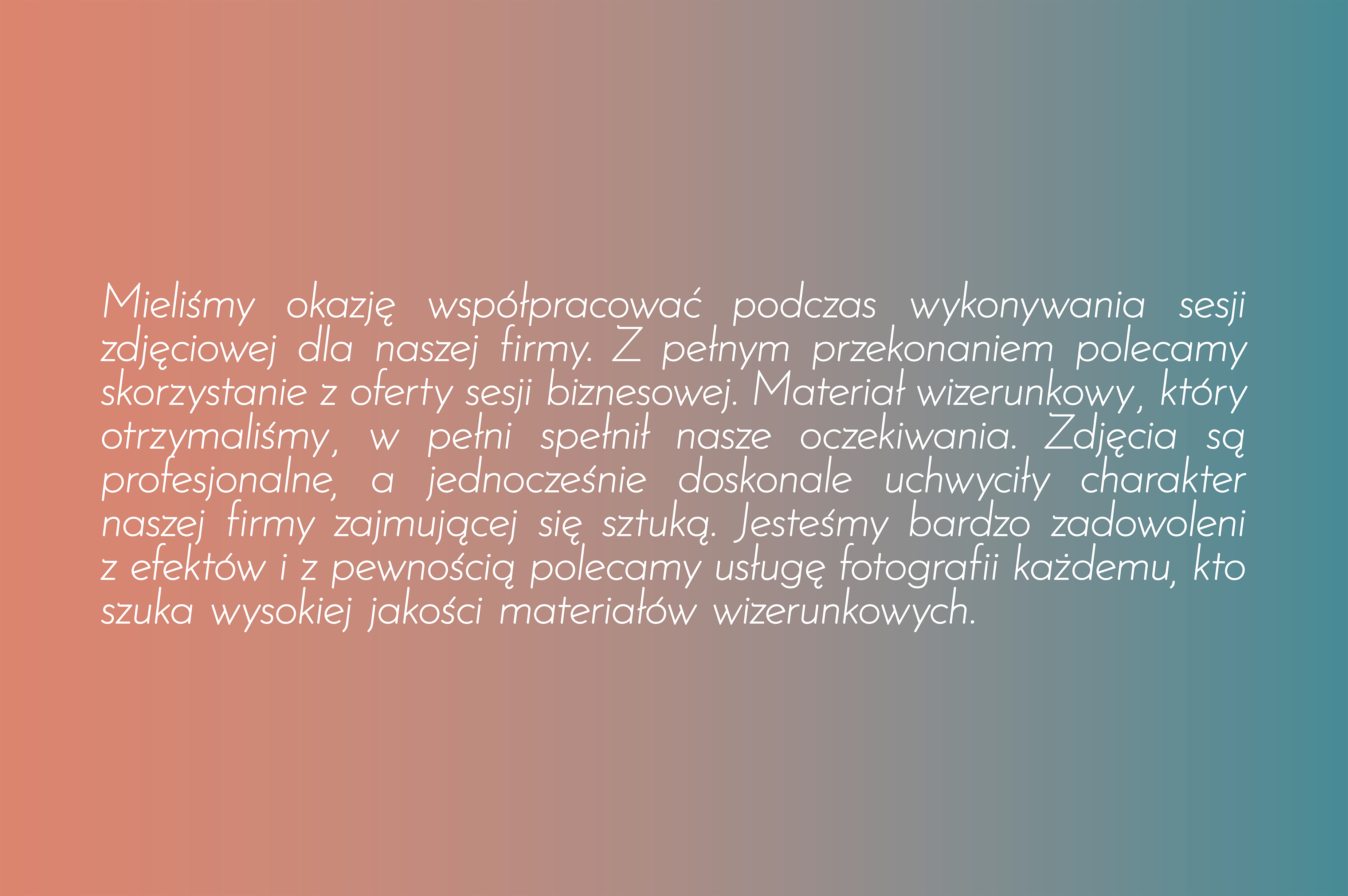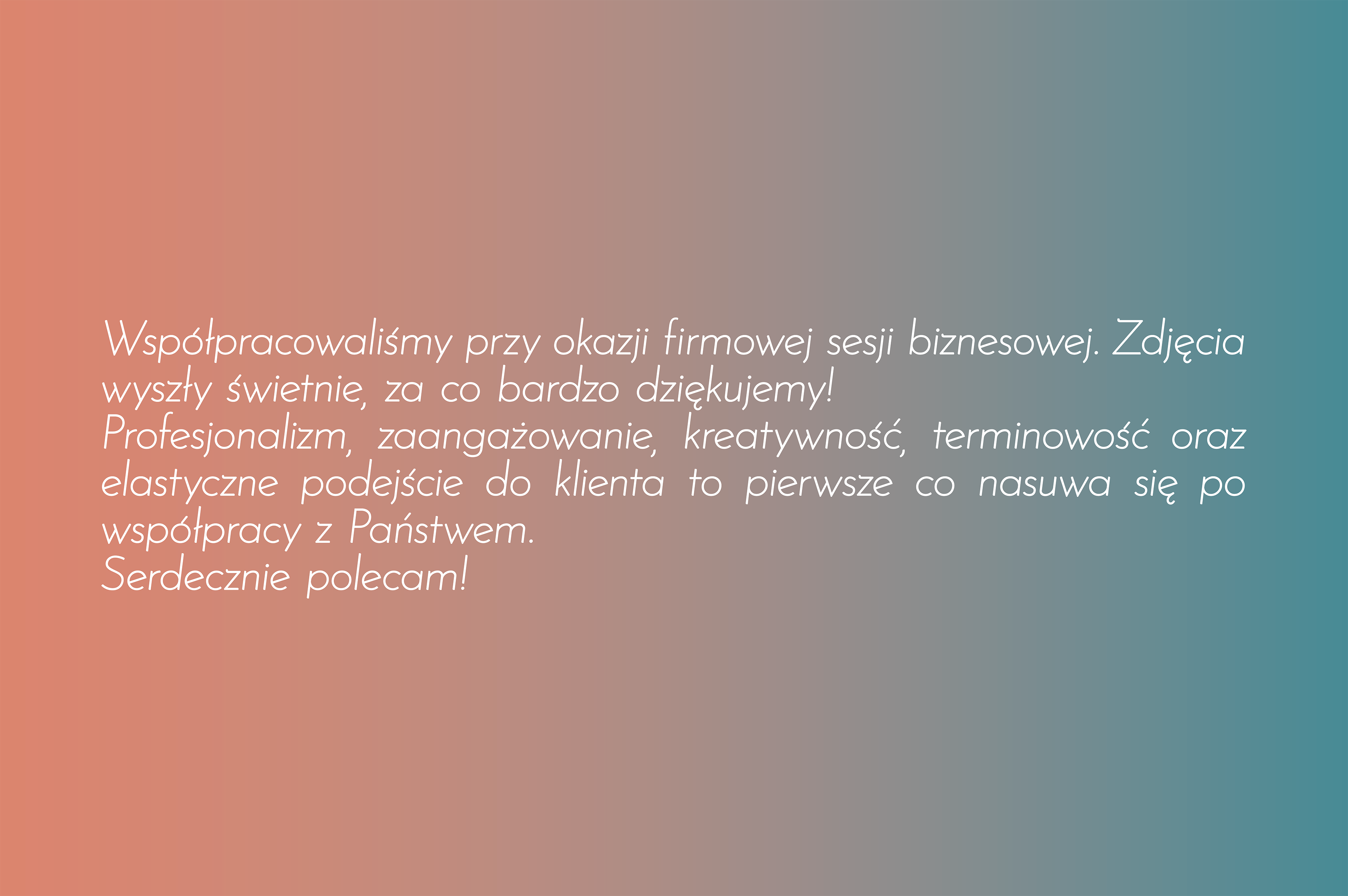 Realizujemy portrety wizerunkowe, które stanowią pierwszy kontakt z klientem. Jest to usługa dla pracowników, właścicieli przedsiębiorstw, osób publicznych, osób budujących swoje marki osobiste. Portrety biznesowe są wizytówką, która może być wykorzystywana na wielu polach: stronie internetowej, w portfolio, na profilach w social media, na platformie LinkedIn, w materiałach firmowych i promocyjnych.